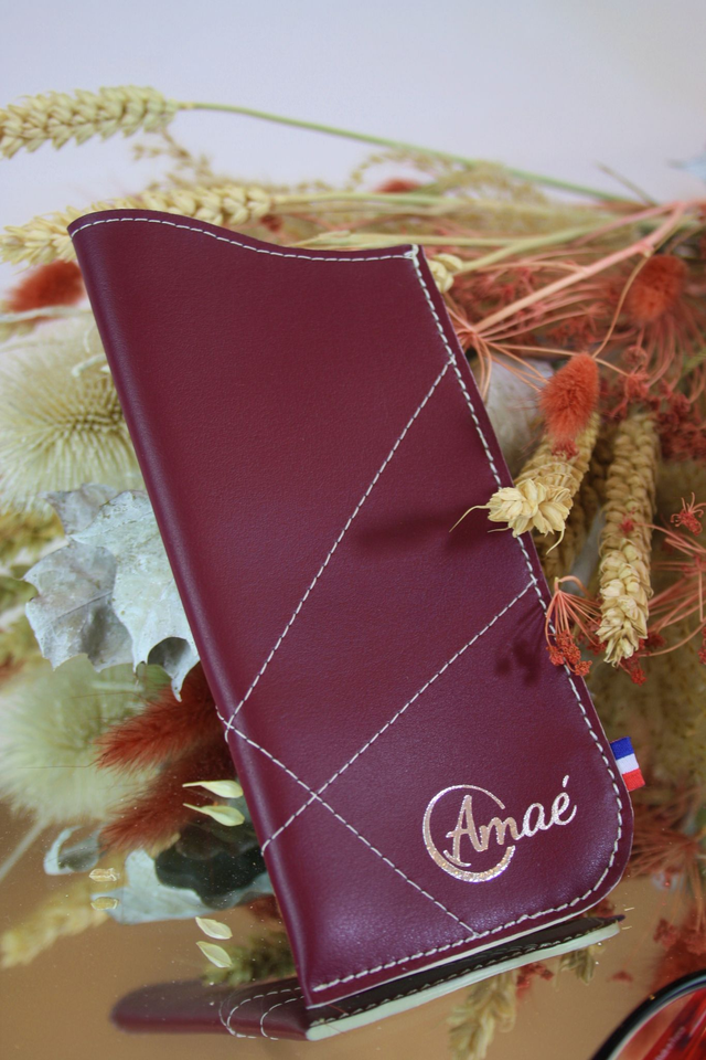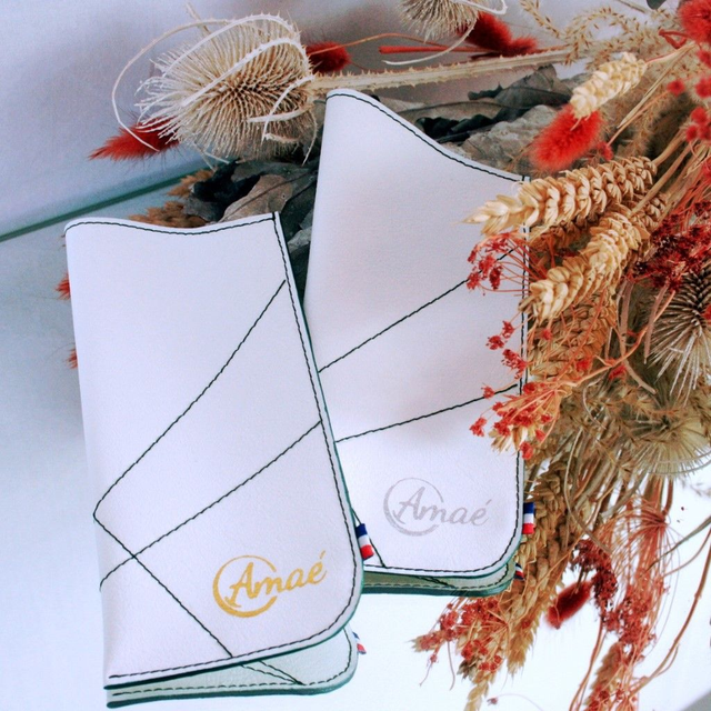 Étui a lunettes en cuir de raisin et coton bio avec surpiqûres et bords teintés.